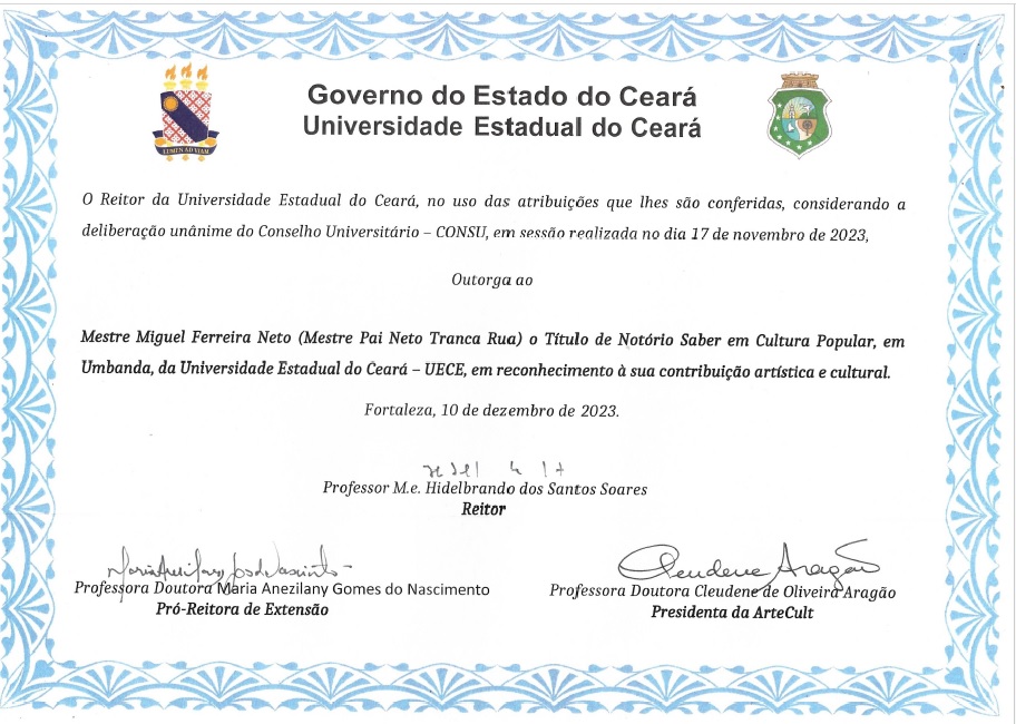 Título de Notório Saber em Cultura Popular em Umbanda, da Universidade Estadual do Ceará (UECE) desde 10 de dezembro de 2023.